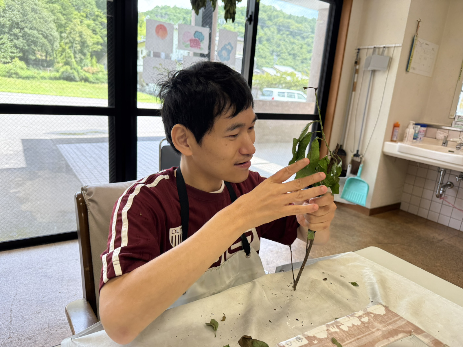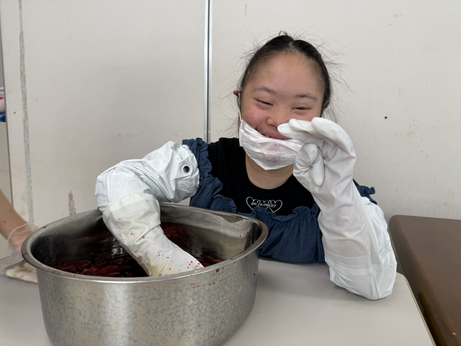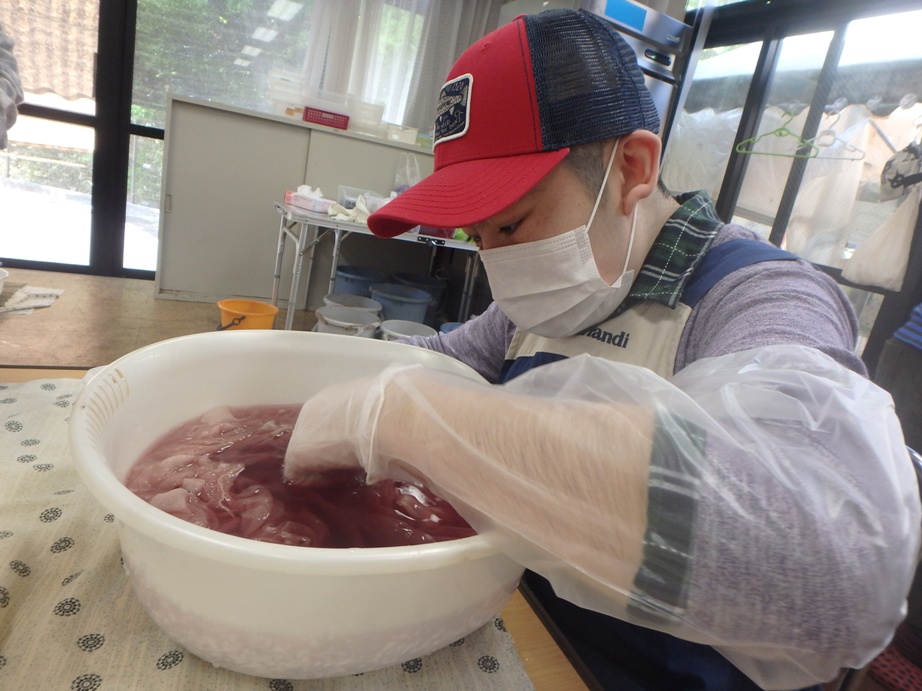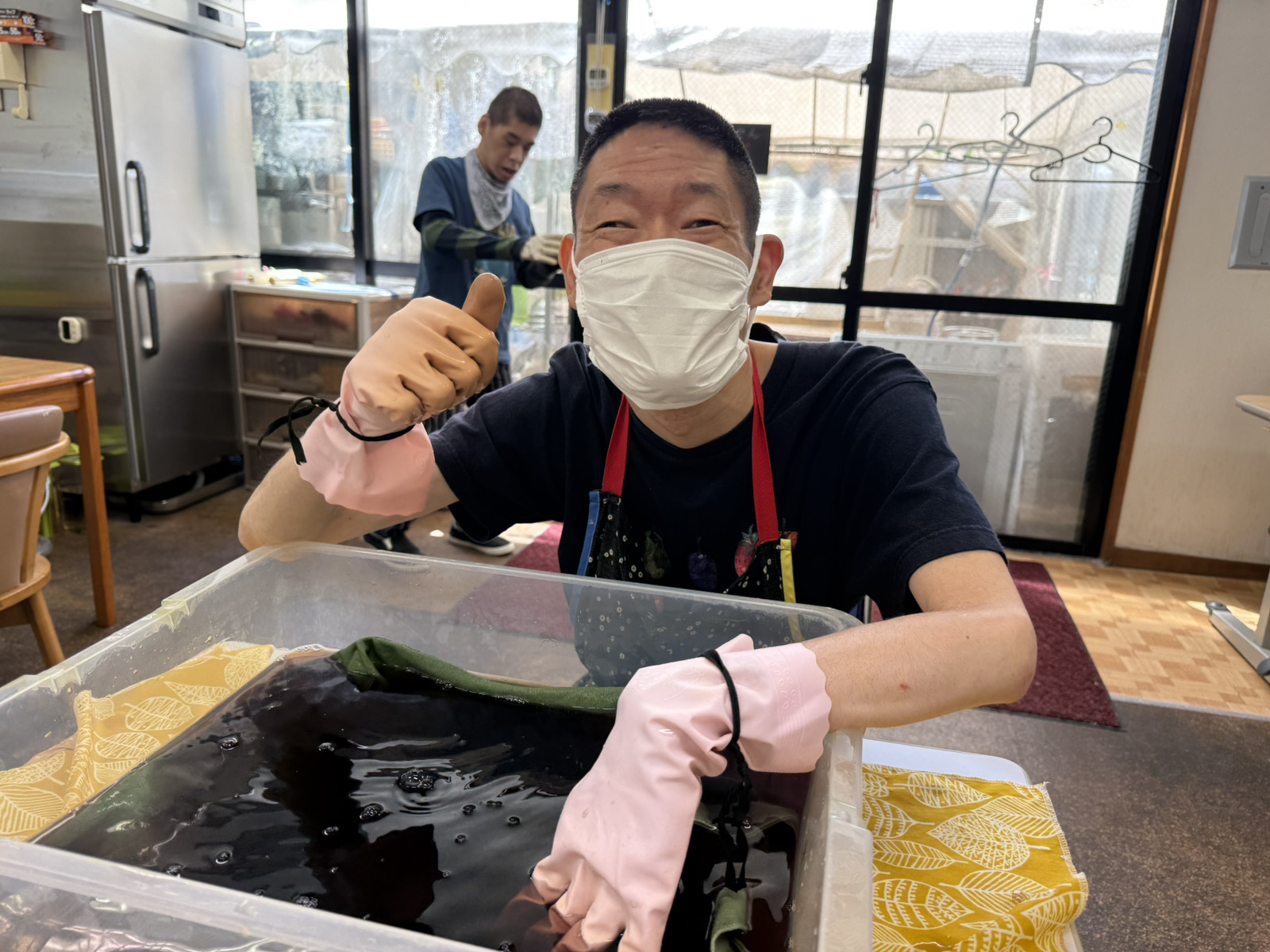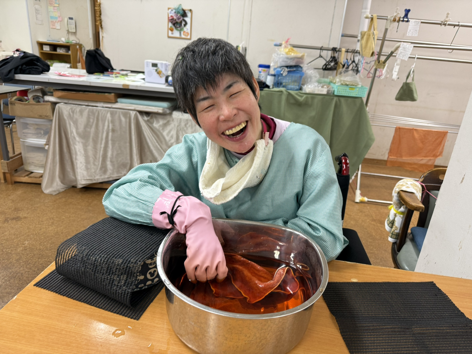 吉迫さんは、みかんの葉っぱちぎりをしました。ちぎった葉っぱが桶の中に入っていて、大事そうに抱えています。今日のみかんの葉っぱちぎり楽しかった?と聞くと、桶を抱えたままニコニコして染めをしている、みんなのいる方を見ていました。その見ている先には、前川さんがサザンカの花びら染めをしていました。今日のサザンカの花びら染め液は泡立ちがすごい!!前川さんも、すごい泡に笑っています。サザンカのストールは、濃くて深いピンク色に染まりあがりました。