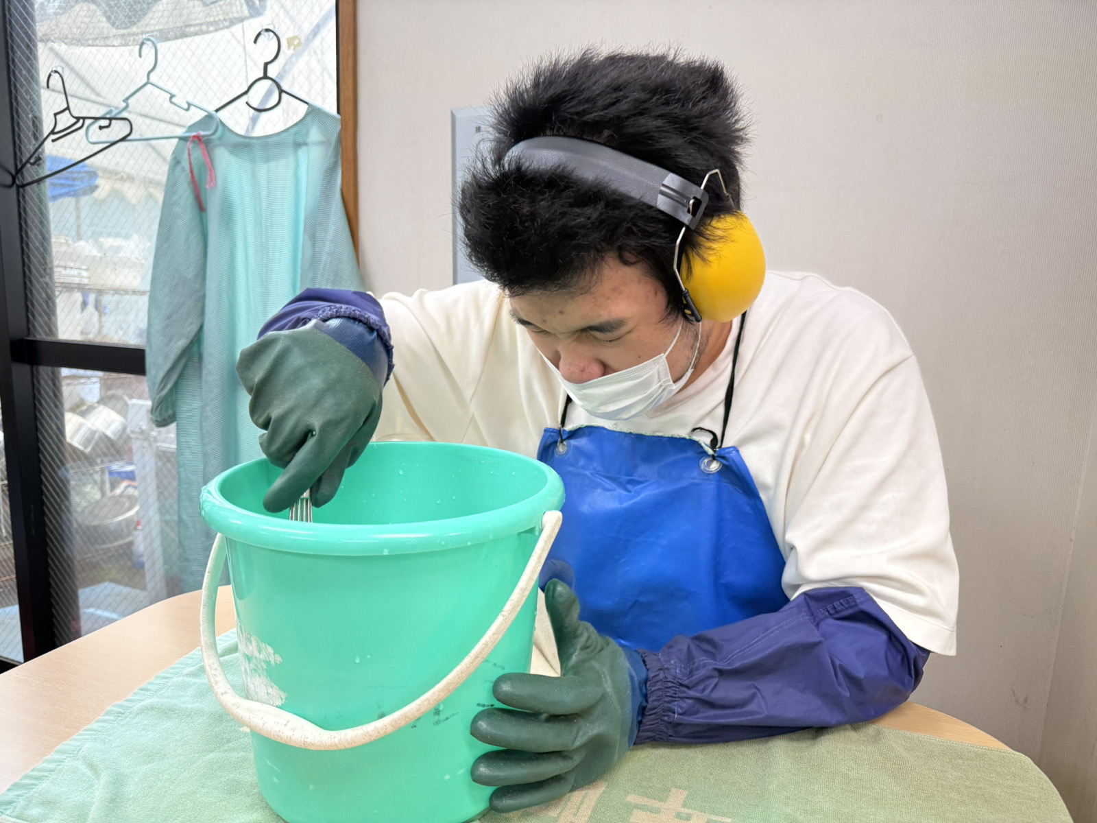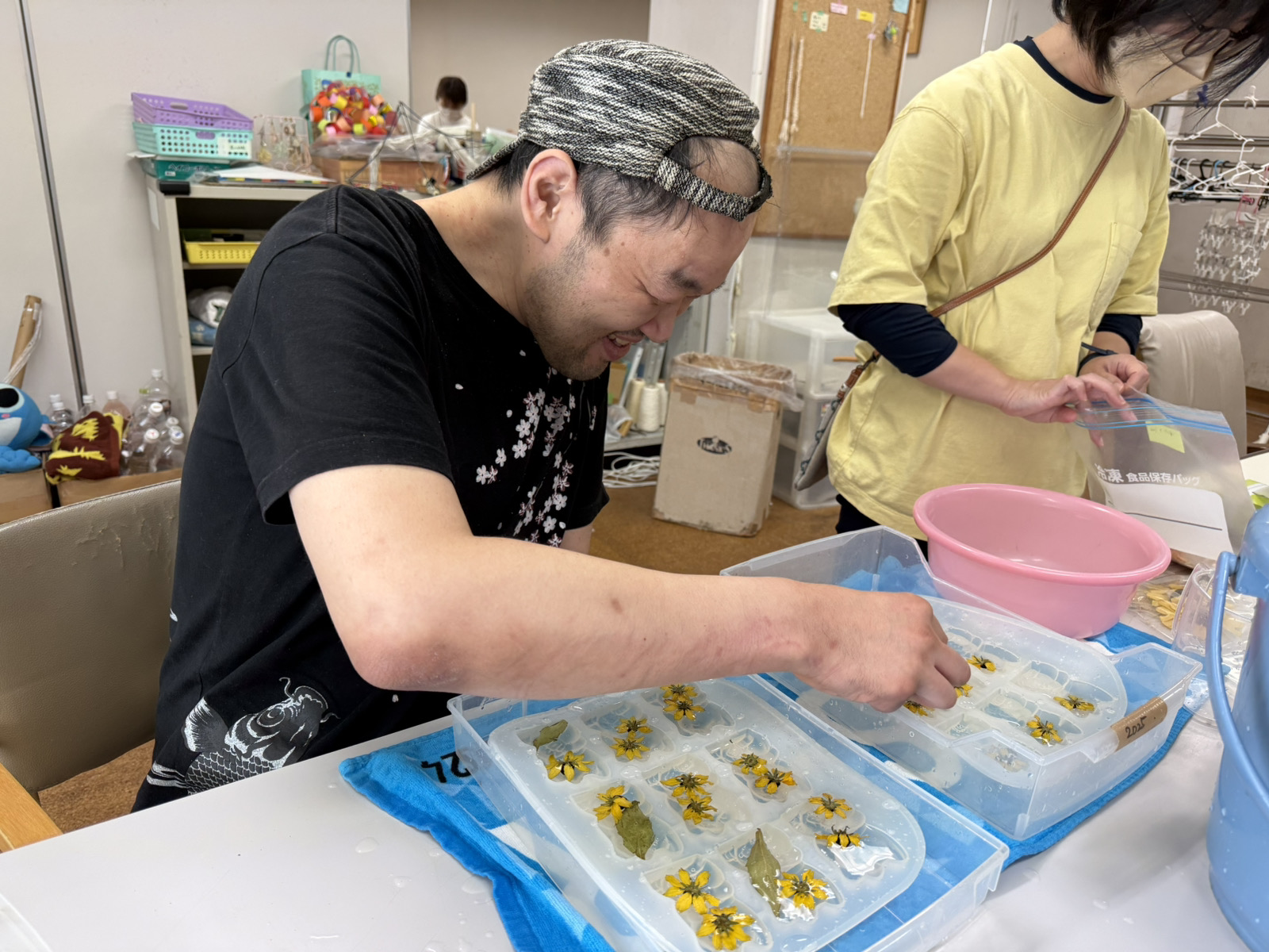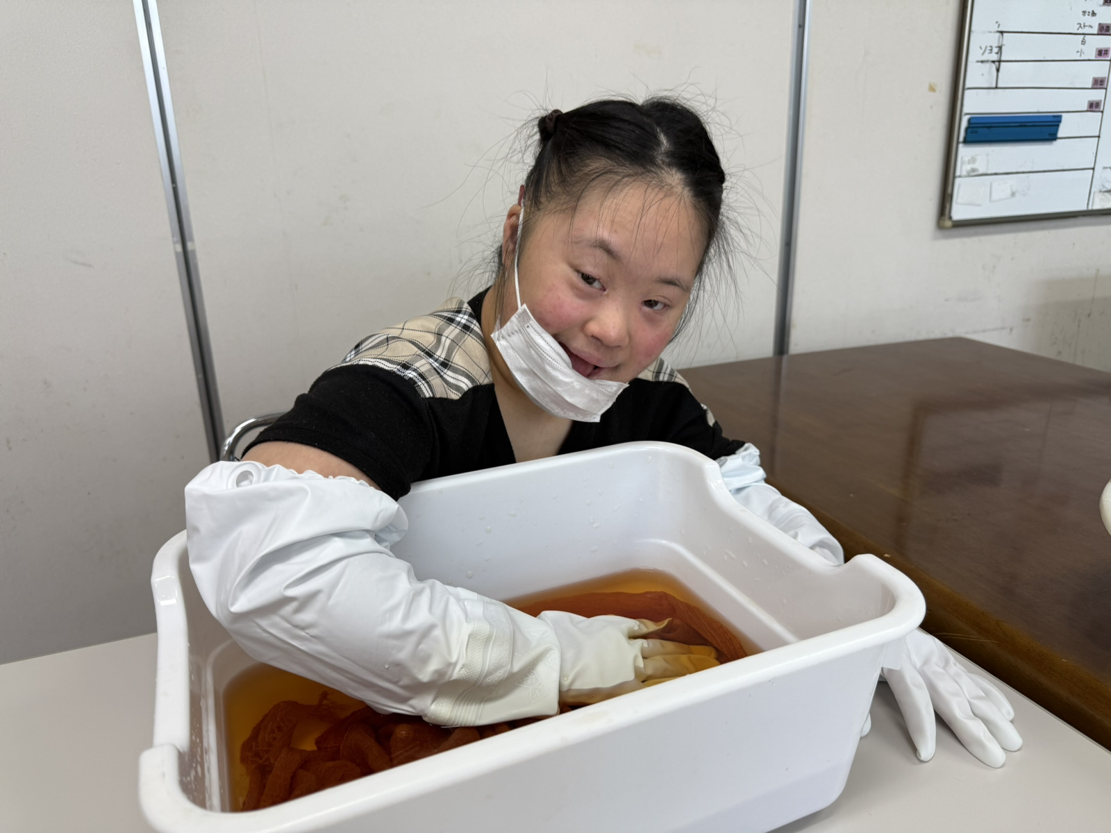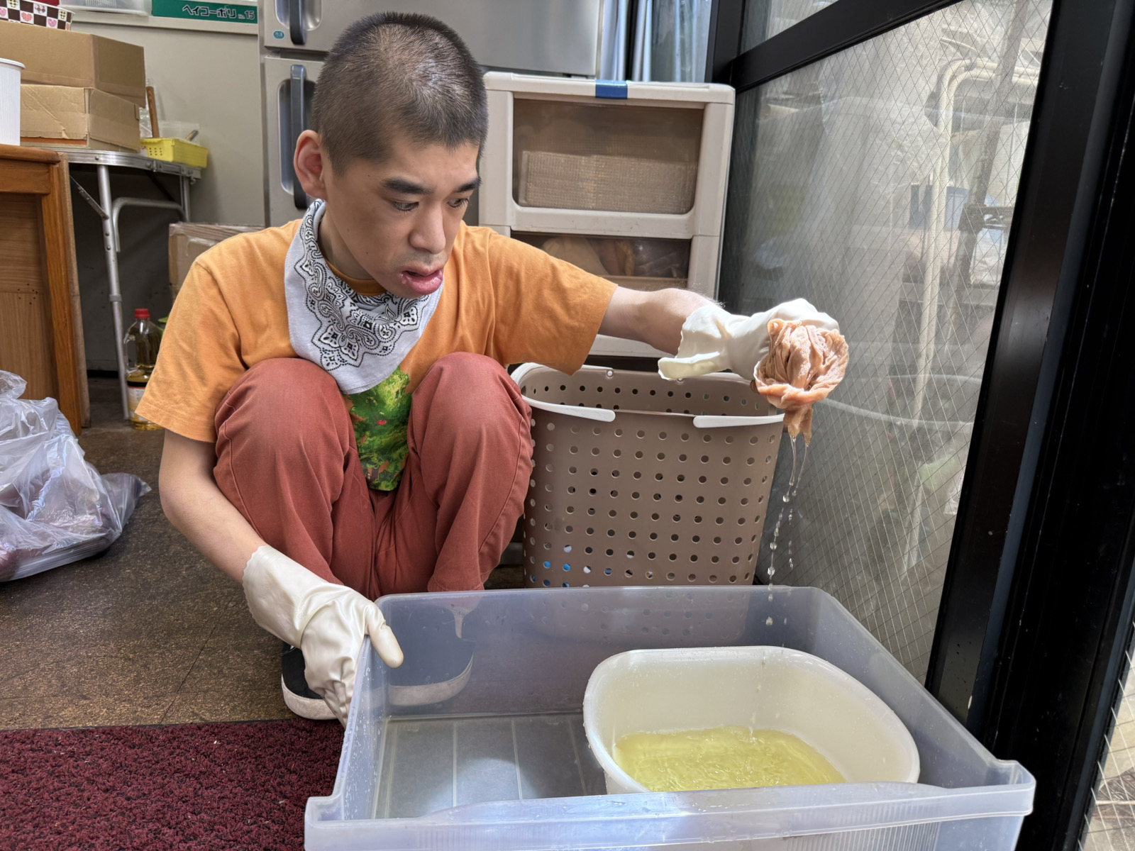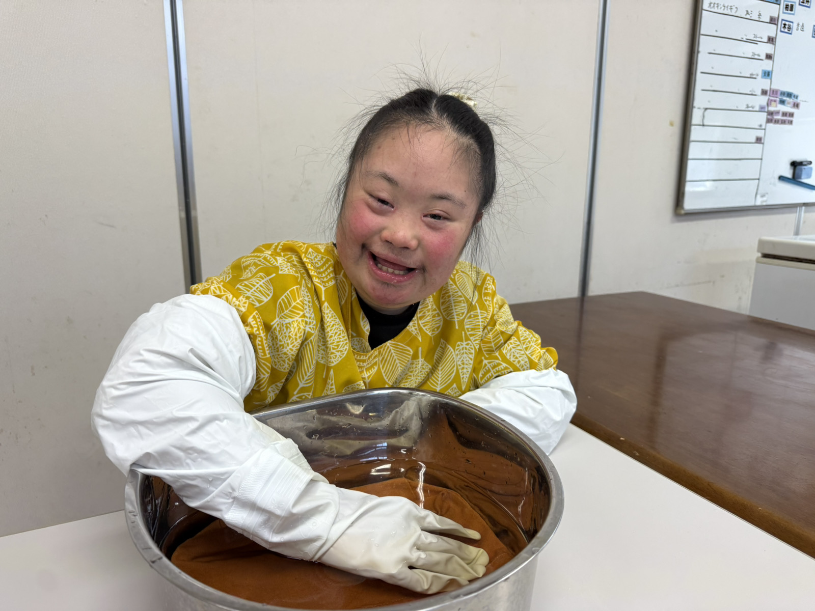 吉迫さんは、みかんの葉っぱちぎりをしました。ちぎった葉っぱが桶の中に入っていて、大事そうに抱えています。今日のみかんの葉っぱちぎり楽しかった?と聞くと、桶を抱えたままニコニコして染めをしている、みんなのいる方を見ていました。その見ている先には、前川さんがサザンカの花びら染めをしていました。今日のサザンカの花びら染め液は泡立ちがすごい!!前川さんも、すごい泡に笑っています。サザンカのストールは、濃くて深いピンク色に染まりあがりました。