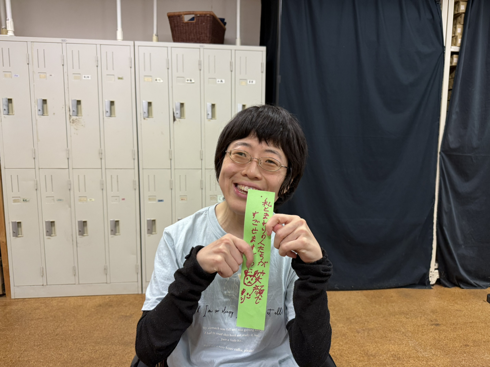 安藤さんは、最近花の名前をいっぱい覚え、自分が染めたい花の名前を言ってきます。明日の午前中は草木染で、蝋梅でストールを染めやる!!午後は、ききょうの花びら染めをしたい!!と帰りの打ち合わせで伝えてきます。今日みんなが帰ったあとの夕方、百々染工房のホワイトボードにメッセージが書いてあるのを見つけました・・・・。