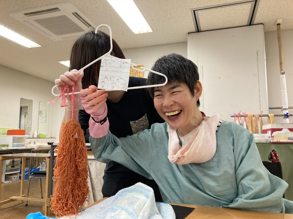 前川さんは、あかねの染液で糸を染めました。優しい手つきでゆらゆらと染め上げた糸は、鮮やかなオレンジ色に!!スタッフに「素敵な色になったね」と声を掛けられると、満面の笑みで染め上げた糸を見せてくれました。