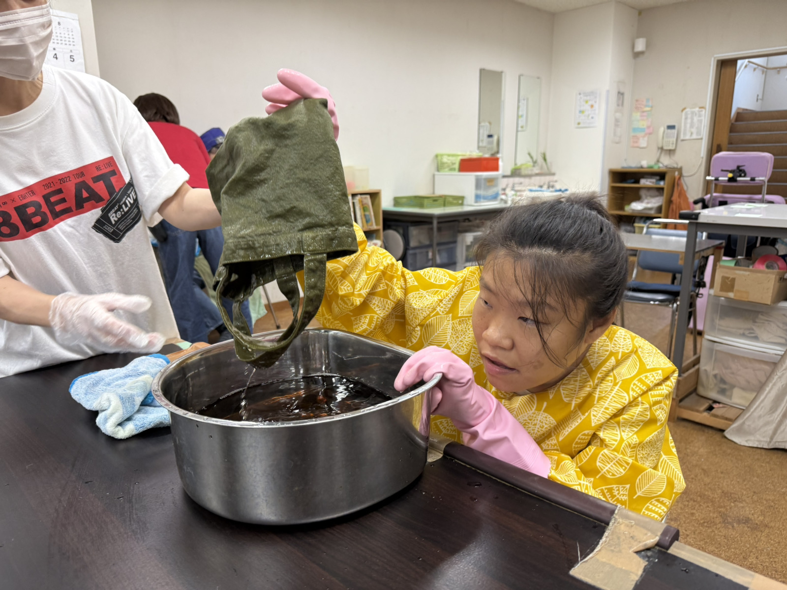 小森さんはあさがおの染液でストールを染めました。ストールに色が入って行く様子を確認しながら、優し手つきで染めてくれます。小森さんにストールに色入って来た?と尋ねると、「バッチリ!!」とポーズを決めて教えてくれました。