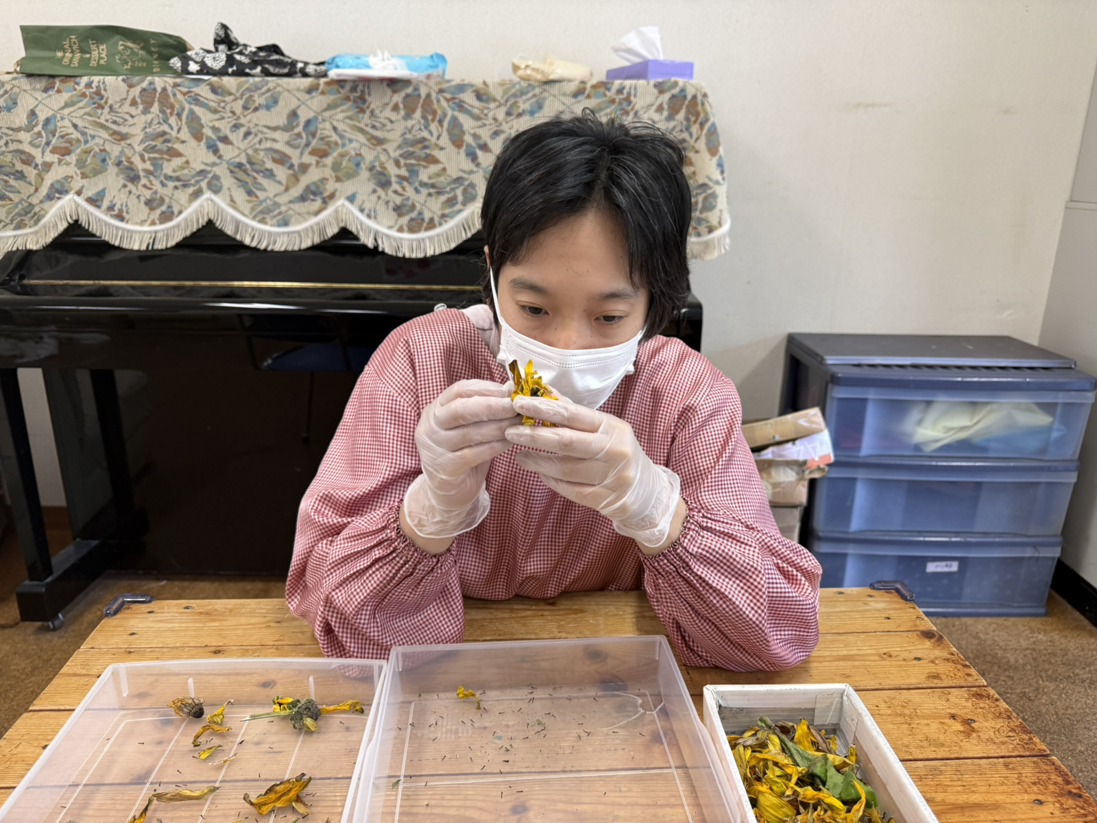 木谷さんはルドベキアの花ちぎりをしました。ルドベキアは花びらと茎を一緒に煮出すと黄色、ガクのみを煮出すとカーキ色になるとっても不思議な植物です。そのためガクと花びらを分ける工程を木谷さんは優しい手つきで次々と行ってくれました。