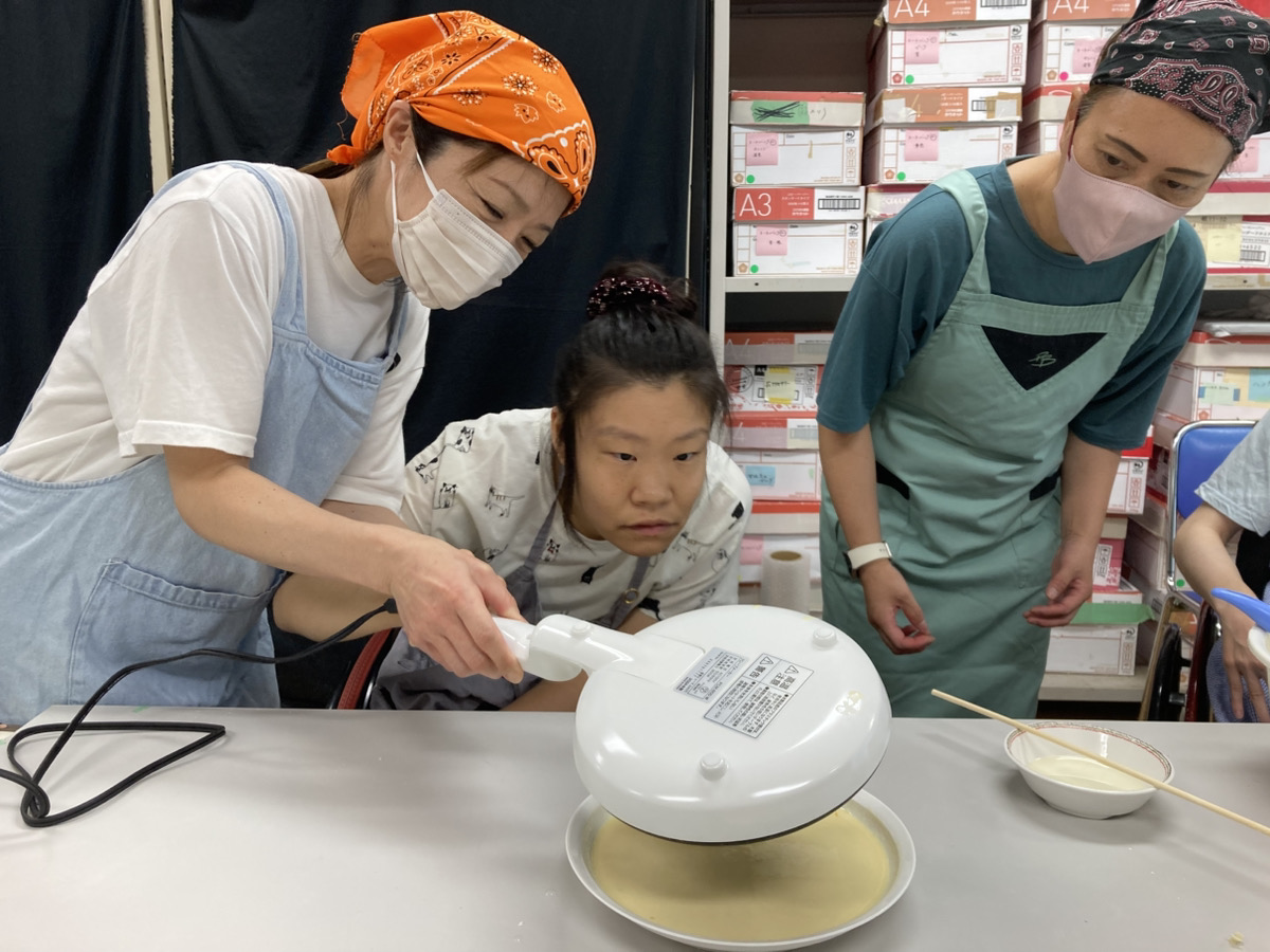 ボールに粉と卵、牛乳を入れてかき混ぜたあとは、クレープメーカーが大活躍!いつも色々なことが気になる岩本さんも、今日はクレープづくりに夢中です♪