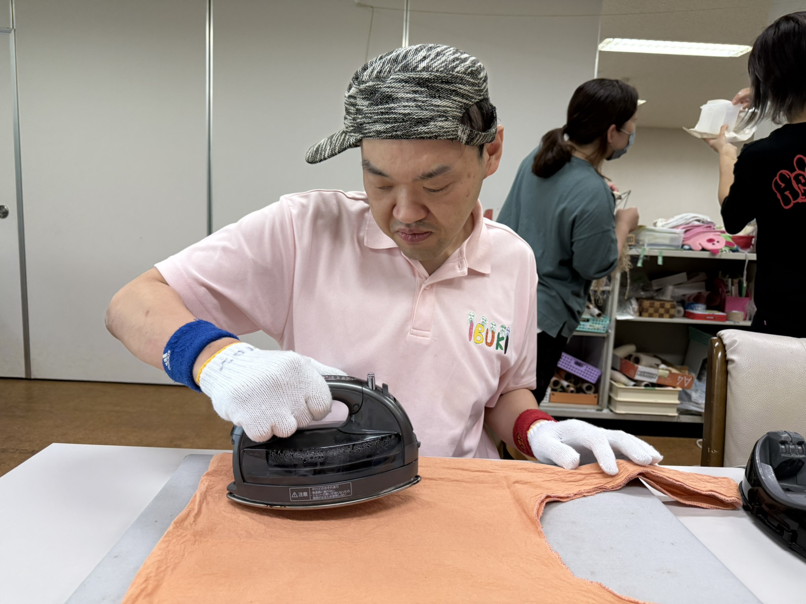 岩田さんはマルシェバッグやストールの仕上げのアイロンがけをしてくれています。「僕がやるとシワが伸びるんやてー」と得意気に教えてくれました♪