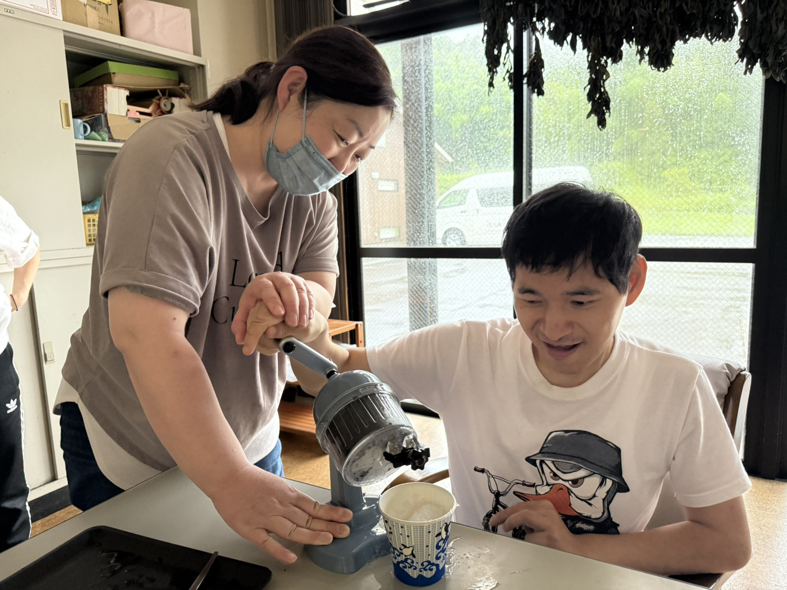 祝日の今日は開所日でした。何かしようよ!!と、雨だけどみんなでカキ氷を作りしました。みんな自分のカキ氷を自分で削って作りました。グルグルハンドルを回し、楽しく削って、シロップと練乳をかけ、みんなで美味しくいただきました♪