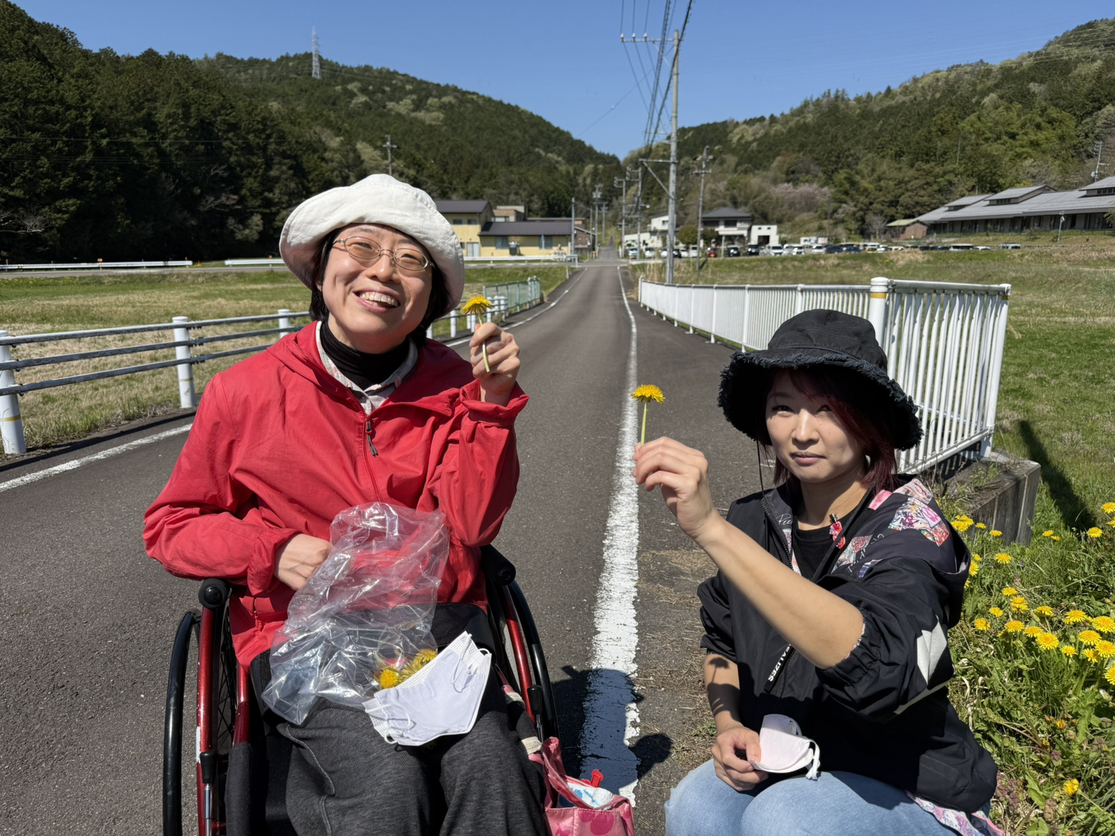 寒いなかお気に入りの場所まで散歩と草木の採取にでかけました。藤田さんと山田さんは手をつないで一緒に歩幅を合わして歩いています。二人で何やらお話をしています。山田さんは季節外れのタンポポを見つけ採っています。不思議ですね。藤田さんはどんぐりを見つけ採っています。そして、お得意のピースサイン!寒い日でもみんなと一緒に歩くと気持ちも体もポッカポカです。